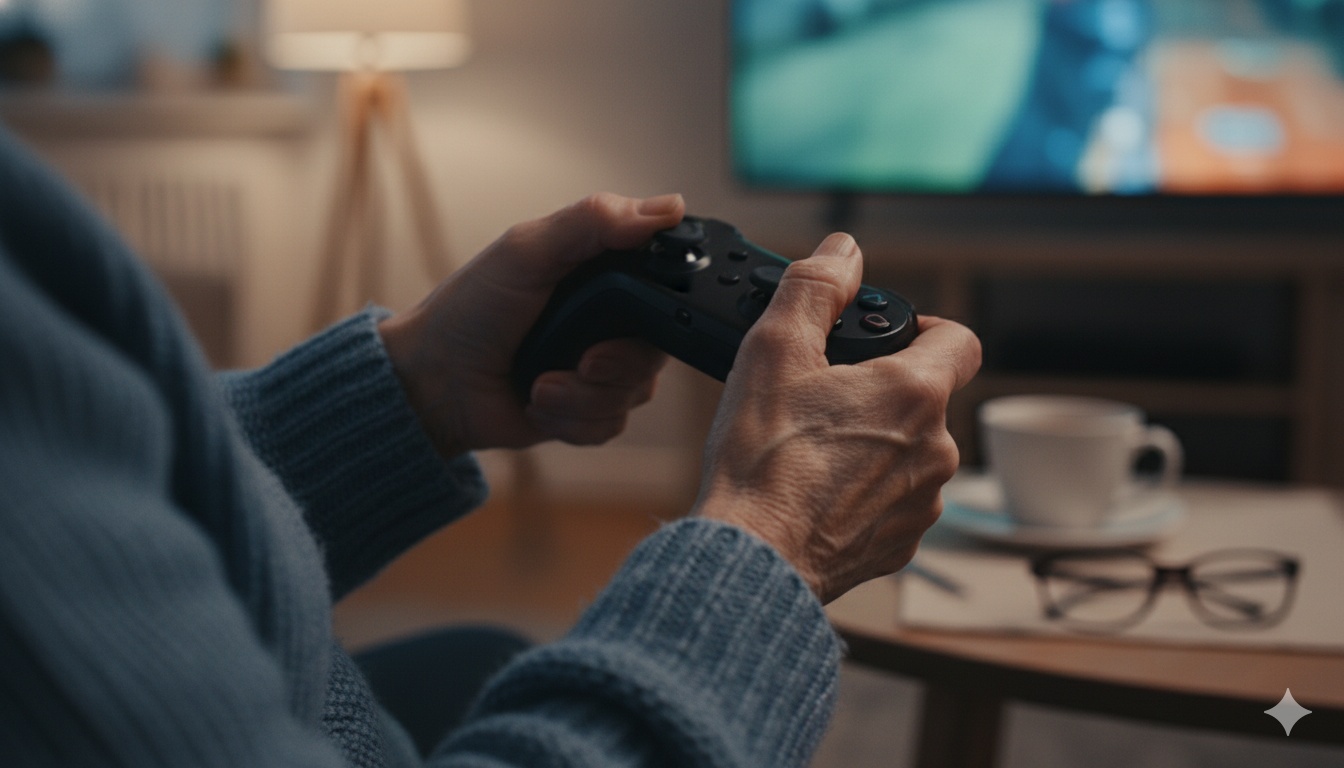 Un'anziana con un controller in mano